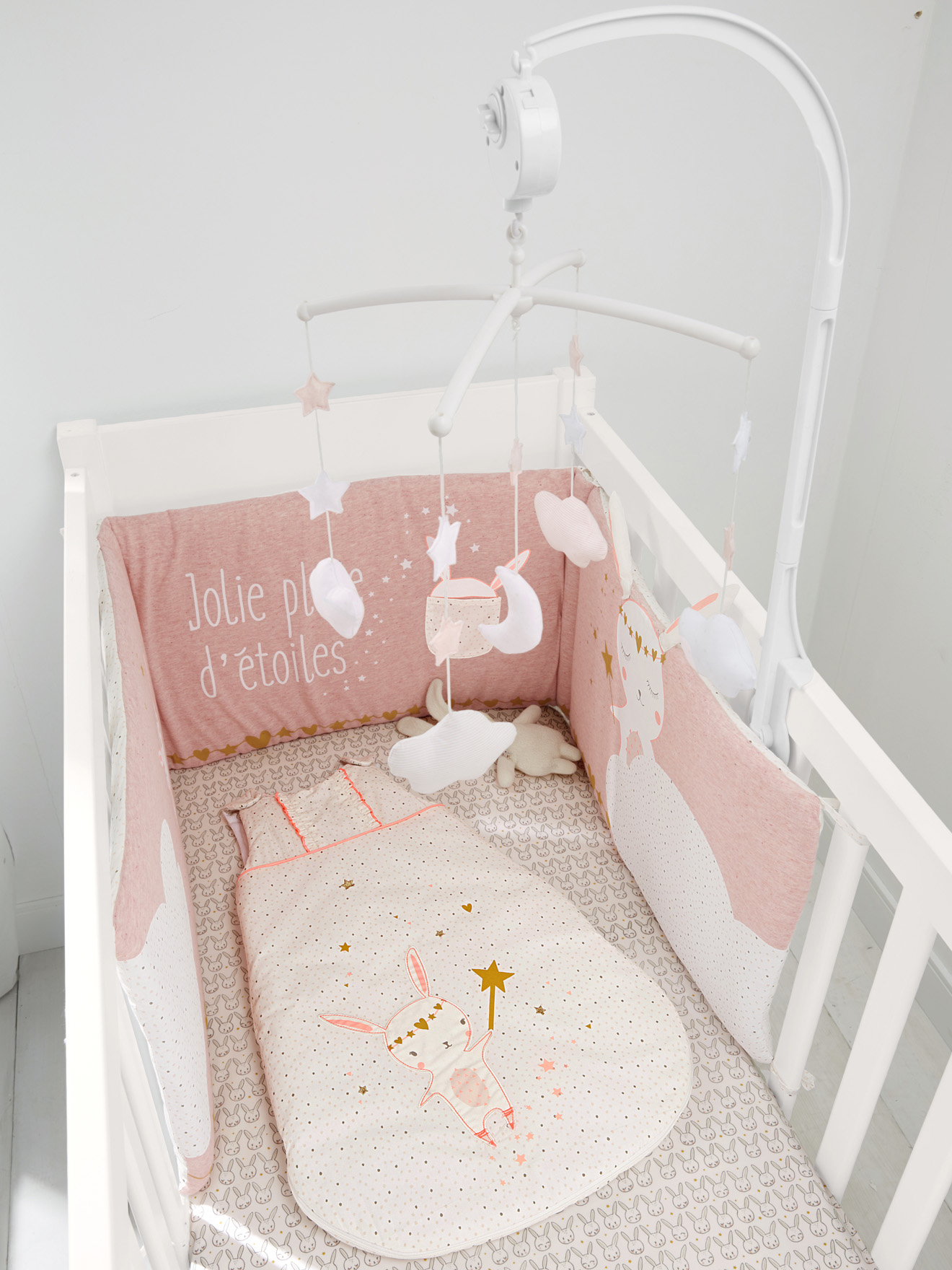 Detailinformationen:Mit seinem Zauberstab lässt der Hase goldene Sterne regnen - ein Baby Nestchen wie im Märchen! Der Babybett Kopfschutz ist niedlich verziert mit Druckmotiven, Applikationen und Stickereien.