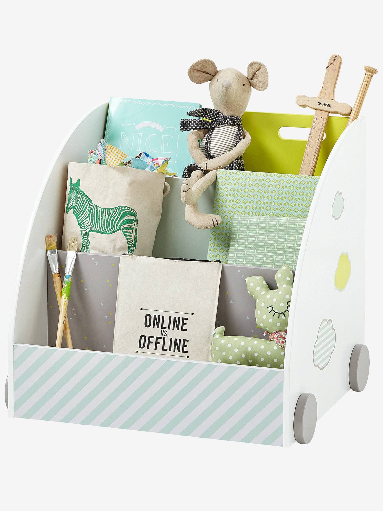 Detailinformationen:Für kleine Bücherfreunde: Bücherregal mit 4 Fächern und einem Geheimfach für die Lieblingsschätze. Vorne können Sie Bücher, Kuscheltiere und Spielzeug so im fahrbaren Stufenregal anordnen, dass auch schon die Kleinsten an ihre Lieblingsbücher und Spielsachen kommen. Das Kinderregal mit Rollen ist hübsch verziert und lässt sich, wenn Besuch kommt auch ganz bequem in eine Ecke rollen.