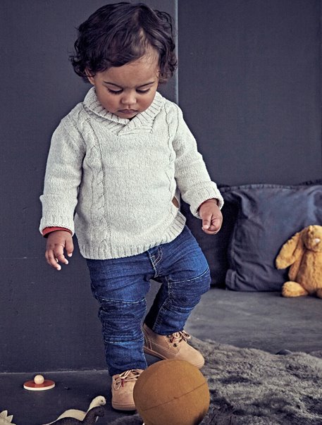 Detailinformationen:Wunderschöner Strickpullover für kleine Herren. Schalkragen und Zopfmuster verleihen dem Baby Pulli einen aktuellen Vintage-Look. Der Kragen hält den Hals warm, ohne einzuengen.